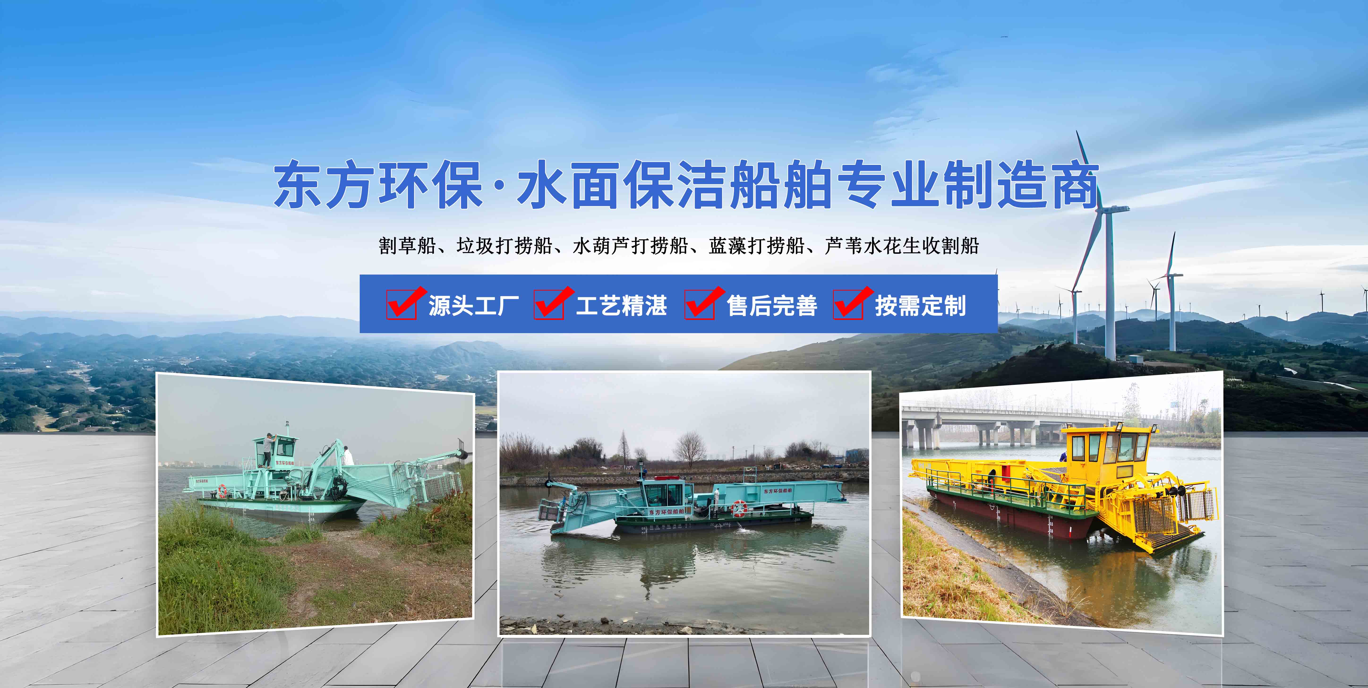 東方船舶是集研發(fā)、生產(chǎn)、服務為一體的現(xiàn)代化企業(yè),產(chǎn)品十幾種系列 主營業(yè)務:清潔船、水草收割船、垃圾打撈船、水面保潔船等